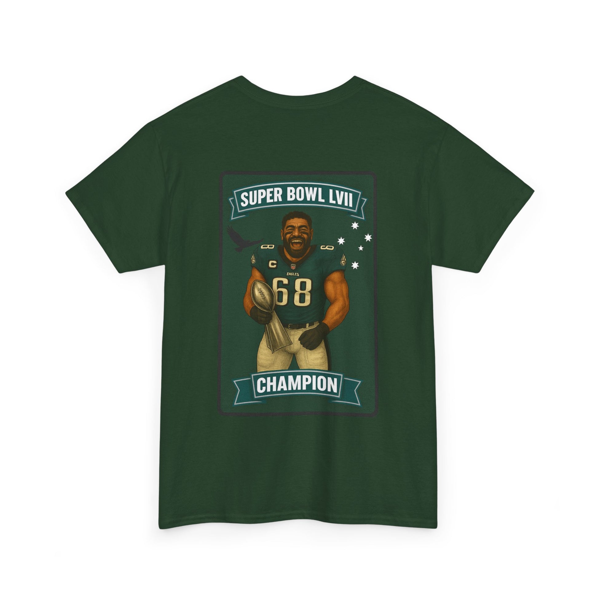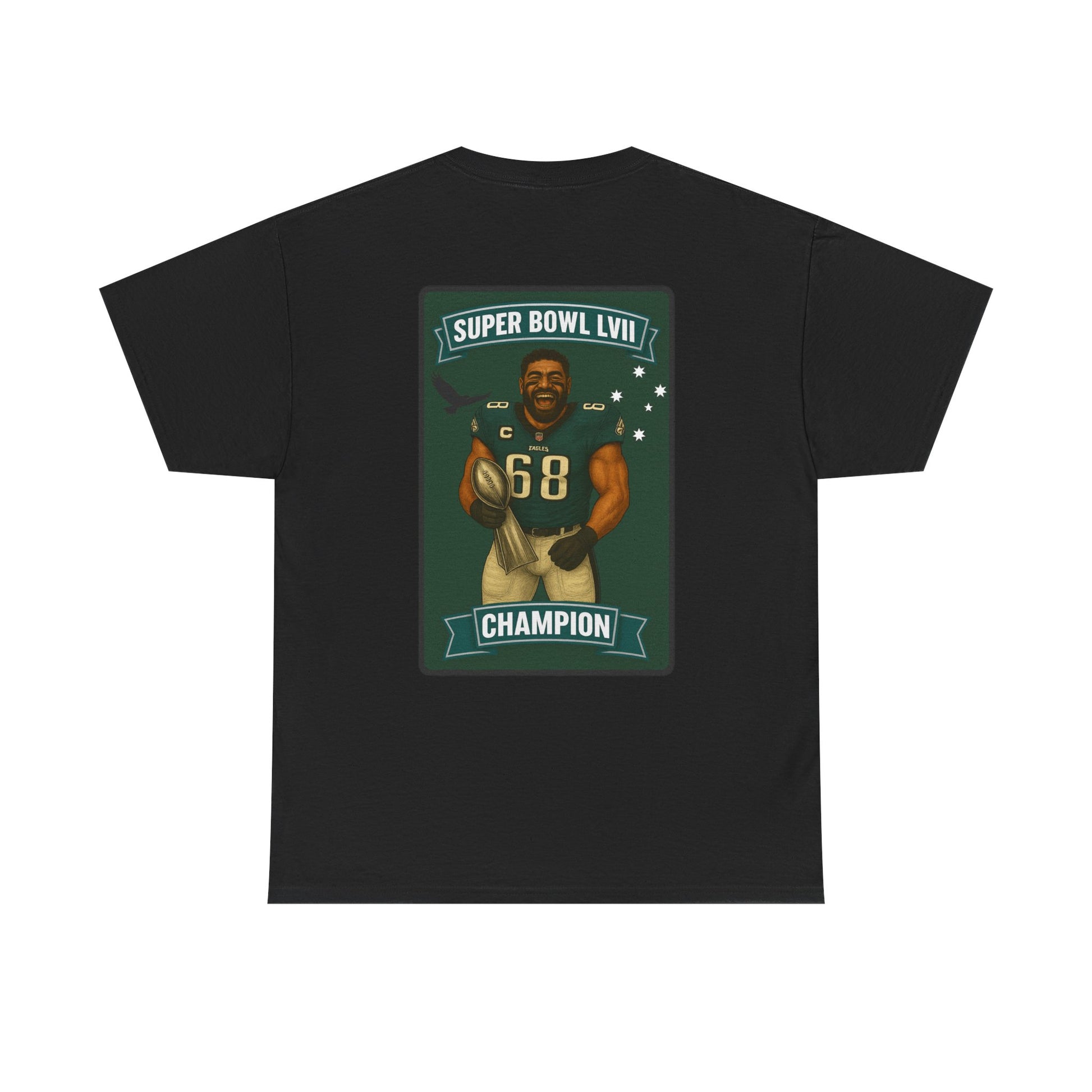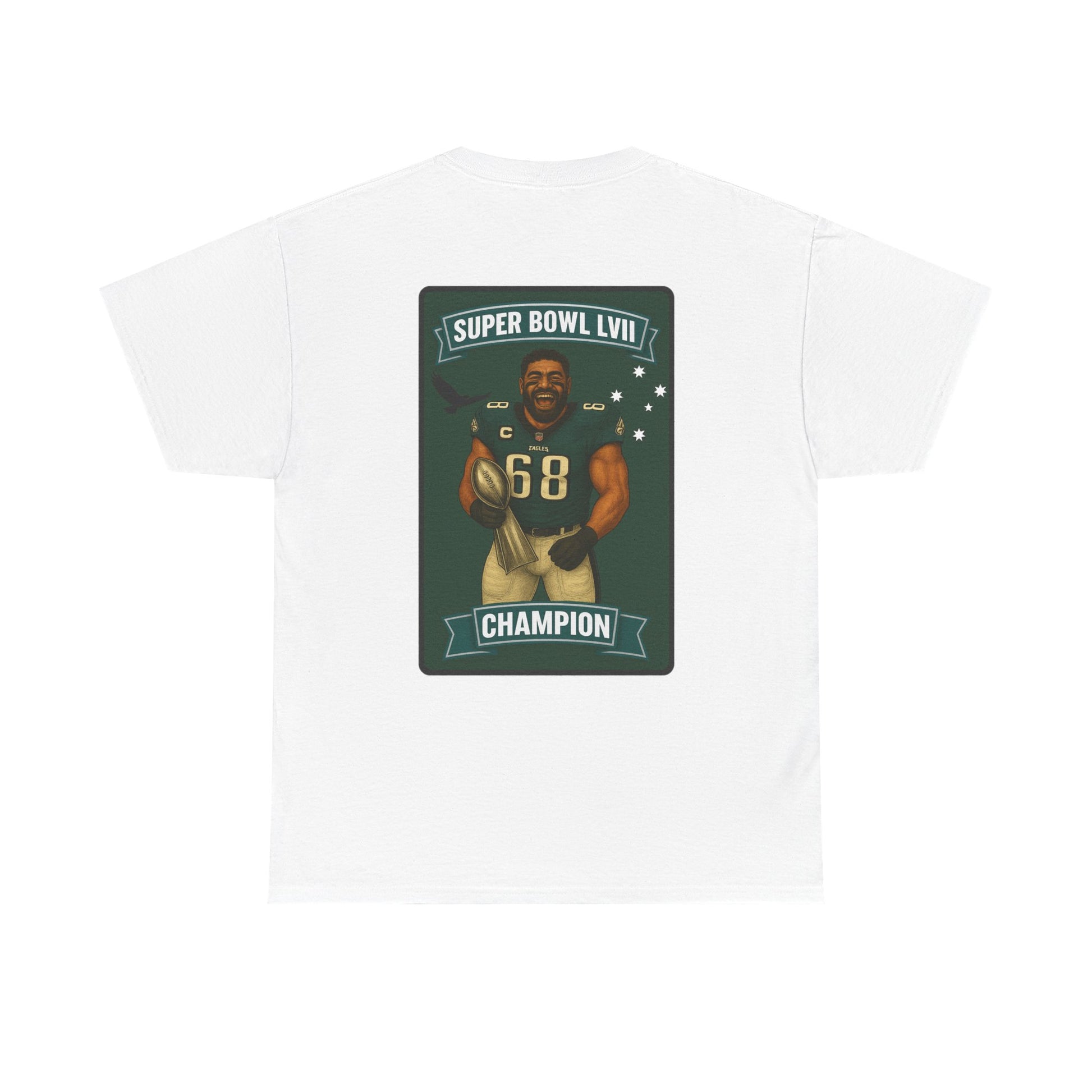 Celebrate history with this exclusive Super Bowl LVII Champion Jordan Mailata tee. This shirt proudly displays a custom card design of Mailata alongside the bold SUPER BOWL LVII CHAMPION title. The back showcases the NFLHDU signature style, making it a must-have for any Philadelphia Eagles fan and NFL supporter.